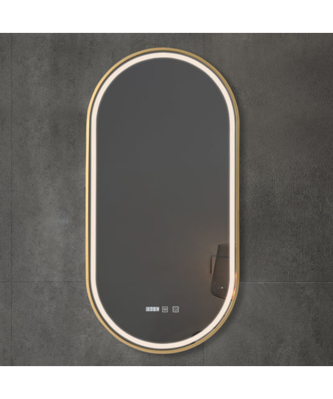 Seamless stainless design frame in brushed gold or black around the mirror