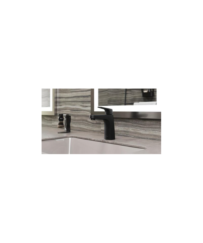 Pfister Matlock faucet in matt black finish. Comes with black pop up drain. Also includes valve, cartridge and decorative plate. Easy to clean and install.